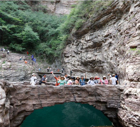 中午12點(diǎn)到達(dá)目的地,休整用餐后,開始游覽大峽谷景觀—景景相連,山靈水秀的谷中之谷桃花谷和擁有壯美風(fēng)光、百里畫廊之稱的太行天路。桃花谷內(nèi)黃龍?zhí)?、飛龍峽瀑布、飛龍峽棧道、九連瀑等景點(diǎn)珠聯(lián)璧合,顯示出深峽藏秀的悠遠(yuǎn)意境?!疤刑炻贰本皡^(qū)位于太行山之巔,全長(zhǎng)約30km,一路望去,峽谷深邃、巖壁峭立,仿佛鬼斧神工,大氣磅礴。